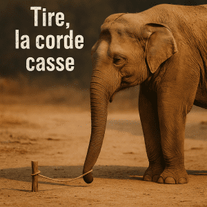 Les jours passent, puis les années. L’éléphant grandit. Il devient massif, puissant, capable de déraciner un arbre d’un coup de trompe. Mais il reste attaché au même petit piquet, avec la même corde fine. Et il ne tente même plus de partir.