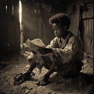 Imaginez pousser la porte d’une cabane sans fenêtre. Une lampe fume et projette des ombres mouvantes. Dans la poussière, un garçon noir de quatorze ans traîne une chaîne rouillée. Cette chaîne marque sa condition ; esclave. Son nom : Frederick.