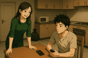 Il relève les yeux. Il entend la demande, claire. Pas de tension dans la voix. Pas de reproche caché. Il sent qu’elle attend un geste, pas un aveu de culpabilité. Il hoche la tête. Et se lève.